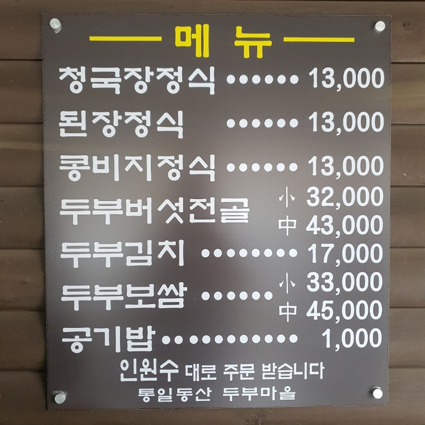 인원수대로 주문을 해야 하기 때문에 동생을 제외한 세 가족이서 먹을 두부 버섯전골과 청국장 정식을 골랐습니다. 전골(소)은 2인 기준입니다.