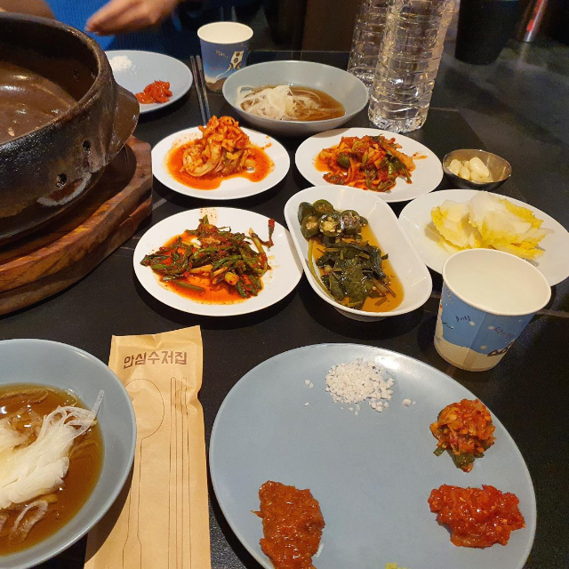 사진에 보이는 것처럼 고기와 곁들일 소스와 밑반찬의 가짓수가 다양합니다. 그중에서도 조개젓과 파김치가 매우 맛있었어요!