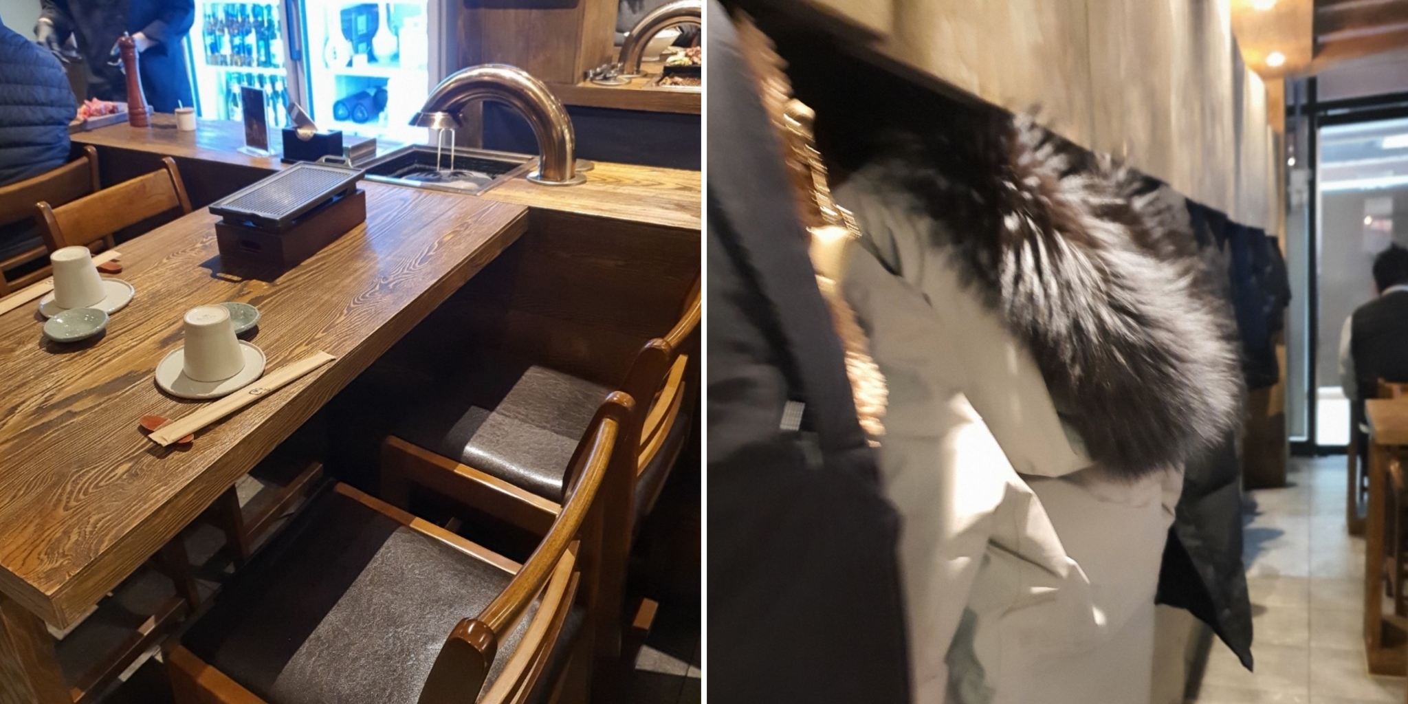 자리가 협소하다 보니 벽면에는 옷을 깔끔하게 걸어놓을 수 있는 장이 있습니다. 추운 겨울엔 두꺼운 외투가 어딜 가나 짐덩이인데, 이런 센스 너무 좋아요!! 부끄러워서 호다닥 지나가면서 찍느라 자신은 흔들렸네요. (하하)