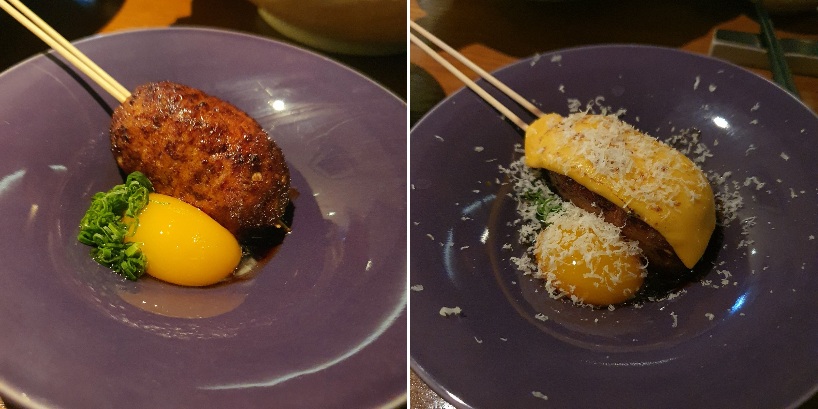 츠쿠네야키는 닭민치와 닭 연골을 완자로 만들어 숯불에 구워낸 요리입니다. 원래는 치즈가 듬뿍 올라간 요리인데, 짝꿍은 치즈를 좋아하지 않아서 빼고 요리해주시도록 말씀드렸어요.