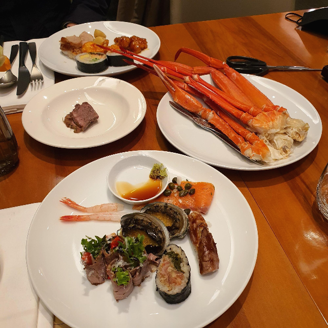 저는 육류보다 해산물을 좋아하기 때문에 일식 코너를 위주로 시작했습니다. 호텔 뷔페라면 홍게 다리는 빠질 수 없죠. ^^