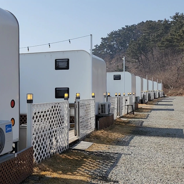 자바카라반 입구에 들어가면 오션뷰를 바라보고 위치한 카라반이 일렬로 줄 서 있습니다.