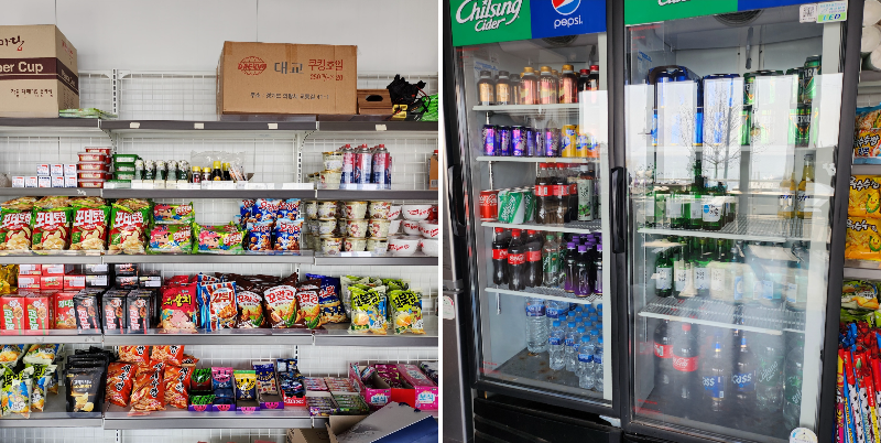 기본적인 스낵류, 라면, 음료 등은 구매할 수 있어요!