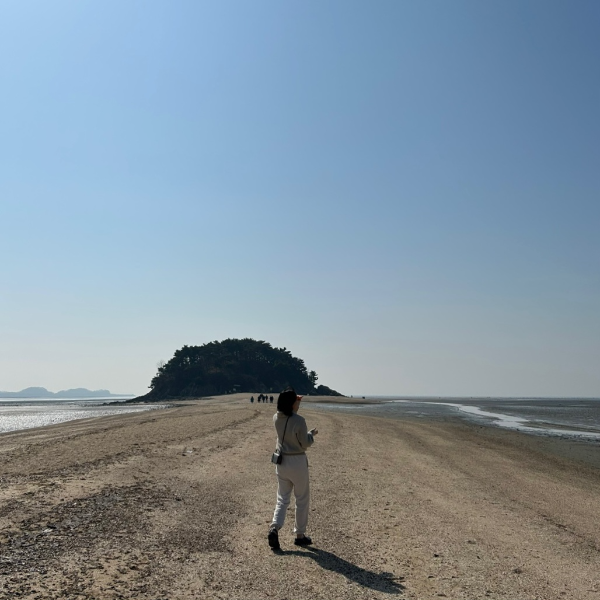 다음날 아침에 어느새 물이 다 빠져서 해안길과 드넓은 뻘이 보이는데 신기한 경험이었어요!! 너무 멋져☺️