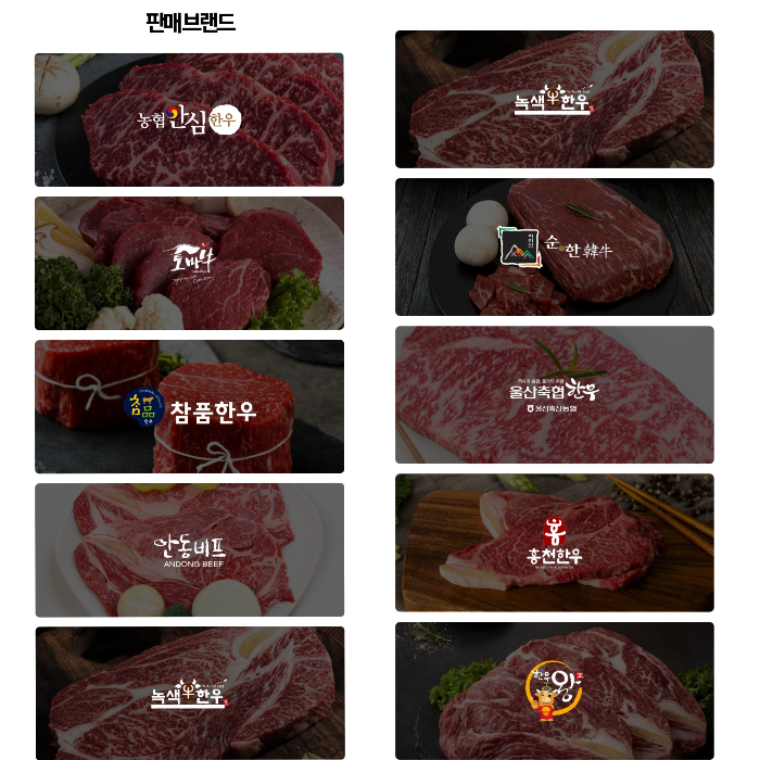 녹색한우(전남), 농협안심한우, 안동비프(경북), 울산축협한우(울산), 지리산 순한 한우(전남), 참품한우(경북), 토바우(충남), 경북대구한우 한우왕(경북), 홍천한우(강원)